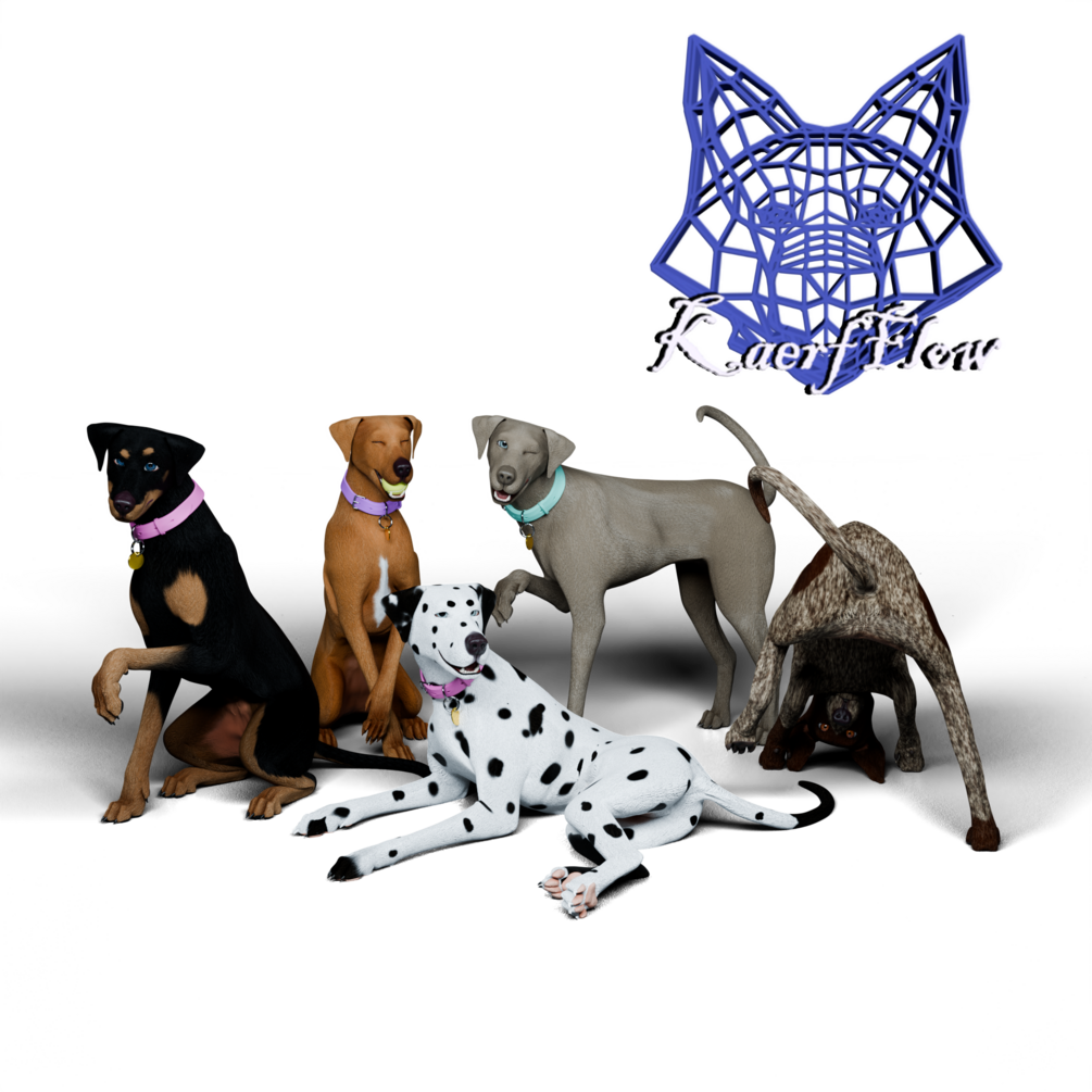 A 3D canine model with a complex rigging system, 5 custom textures, and a texture file to allow you to paint your own custom textures